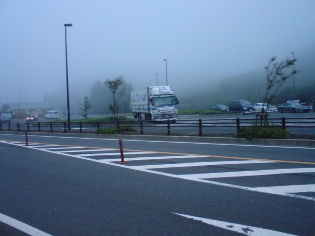箱根峠標高846メートルです。あっ、こんなに登ってたんだ。あとは下りだ。霧のなかを行きます。